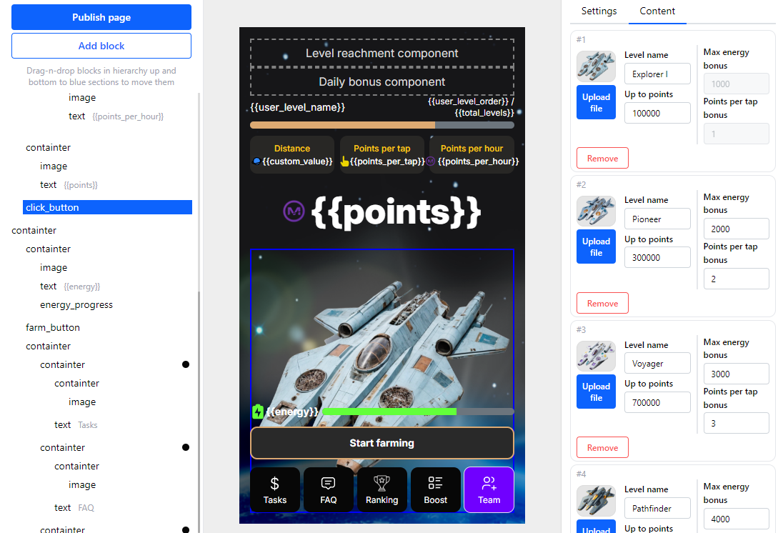 Levels can be configured via a couple of blocks ([click button](https://tgtaps.gitbook.io/tgtaps-docs/blocks/clicker-game/click-button), [level reachment block](https://tgtaps.gitbook.io/tgtaps-docs/blocks/clicker-game/level-reachment), [level progress block](https://tgtaps.gitbook.io/tgtaps-docs/blocks/clicker-game/level-progress)):