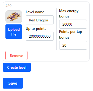* [Max energy](https://tgtaps.gitbook.io/tgtaps-docs/blocks/clicker-game/energy-progress) increase bonus for the level reachment.
