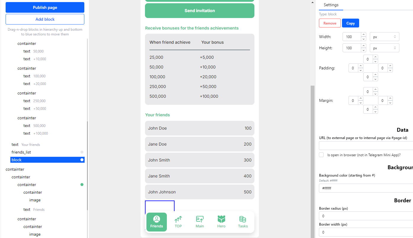Apps can contain many pages. A user can navigate between them via hash links. They can be inserted into text, blocks, images and buttons.